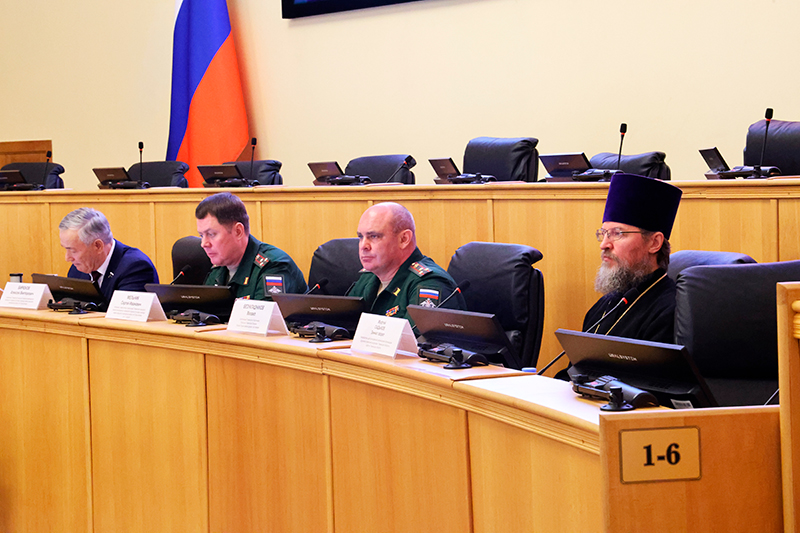В зале областной думы собрались педагоги, политики, представители общественных организаций, председатель епархиального отдела по взаимодействию с Вооруженными Силами и правоохранительными органами иерей Стефан Любимов.