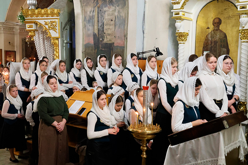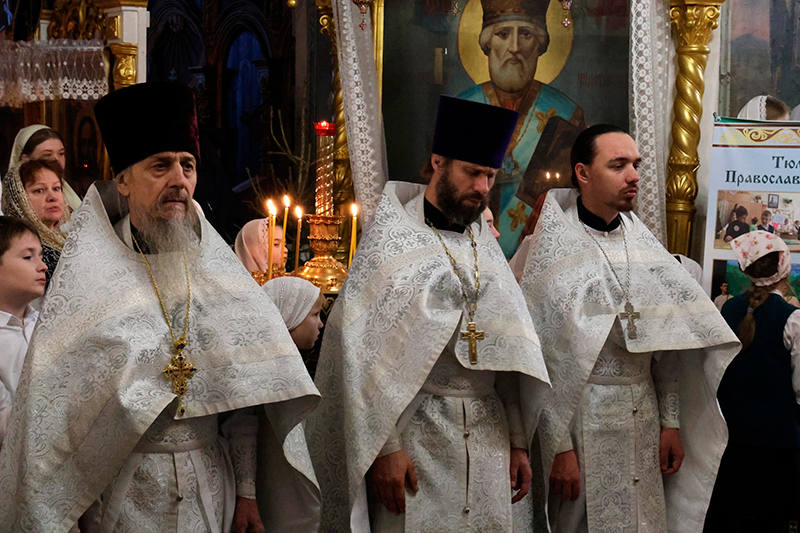 Песнопения Литургии исполнили хор Знаменского кафедрального собора; хор мальчиков Тюменской православной гимназии; хор девочек Тюменской православной гимназии.