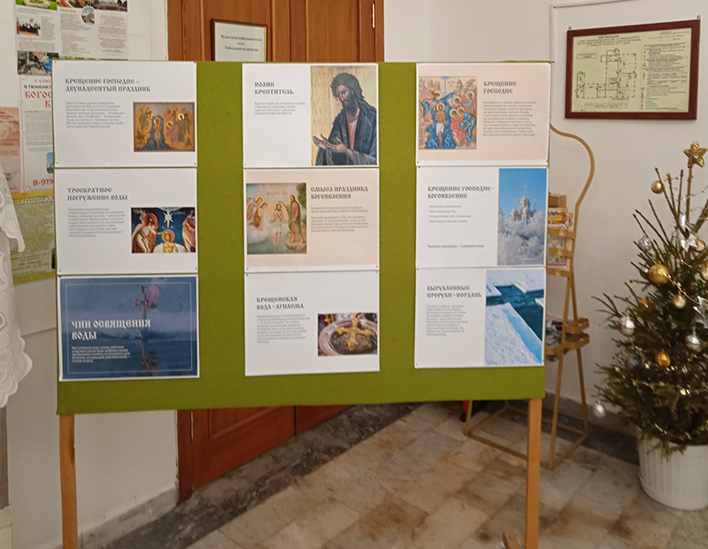 20 января 2026 г. По благословению Его Высокопреосвященства, Высокопреосвященнейшего Димитрия, митрополита Тобольского и Тюменского, в фойе Духовно-просветительского центра Тобольской митрополии в преддверии праздника Крещения Господня и Богоявления 15 января 2026 г. Отделом религиозного образования и катехизации Тобольско-Тюменской епархии совместно с воскресной школой прихода храма Покрова Пресвятой Богородицы с. Каменка подготовлен тематический стенд. Выставка знакомит с историей и духовным смыслом празднуемого события, каждый лист презентации посвящен его отдельному элементу. В частности, рассказывается о Крещении Спасителя в водах реки Иордан и происшедшем при этом Богоявлении, кратко говорится о значении этого события для человечества. Отдельно помещена информация о проповеднике покаяния св. Иоанне Крестителе, о символизирующей р. Иордан ледяной купели-проруби, о святой воде, ее предназначении и правилах пользования ею.