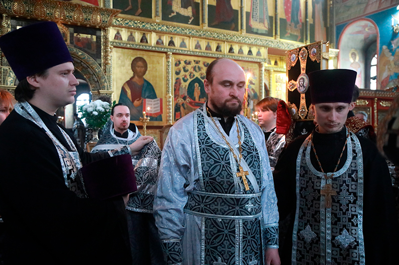 Песнопение «Да исправится молитва моя» исполнили протоиерей Игорь Хмелёв, настоятель Вознесенско-Георгиевского храма г. Тюмени; протоиерей Вадим Баранов, настоятель храма в честь апостола Иоанна Богослова с. Шорохово Исетского района, иерей Виталий Виштак, клирик Софийско-Успенского кафедрального собора г. Тобольска.