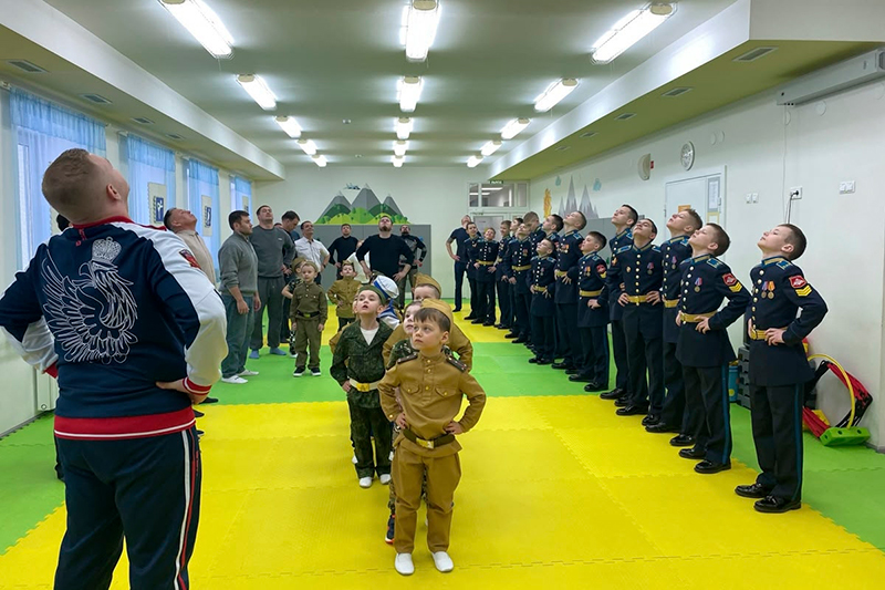 Вторая часть выездного занятия была посвящена встрече с ребятами из детского сада № 146. Кадеты стали участниками праздничного мероприятия, которое приготовили педагоги и воспитанники старшей группы «Умнички». Кадеты рассказали дошкольникам о том, что повлияло на их решение поступить в Тюменское ПКУ, как организован образовательный процесс в училище, какими качествами должен обладать кадет. Малыши слушали семиклассников, а потом приняли участие в игре «Святые воины – наши защитники». С большим удовольствием и дети, и взрослые демонстрировали силу и ловкость в спортивных состязаниях: кадеты соревновались друг с другом, с воспитанниками детского сада, с папами ребят.