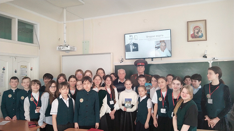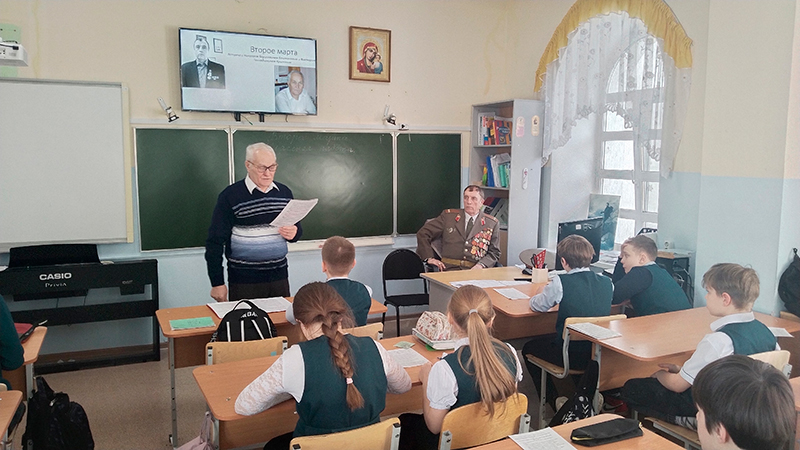 8 марта 2026 г. 2 марта в 5 и 6 классе прошла встреча с членом Союза писателей России Николаем Борисовичем Башмаковым и Виктором Геннадьевичем Крыловым, профессиональным военным. Гости гимназии - выпускники Высшего военно-инженерного командного училища.