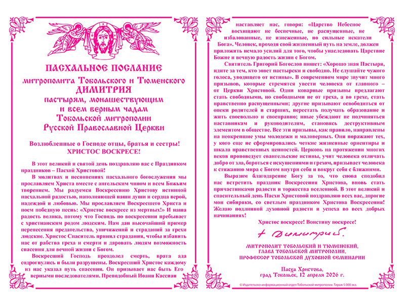 Выразим благодарение Богу за то, что снова сподобил нас встретить праздник Воскресения Христова, вновь стать причастниками радости и торжества вселенной. В этот великий и спасительный день Пасхи Христовой поздравляю всех вас, дорогие мои сибиряки, со светлым праздником Христова Воскресения! Желаю подлинной духовной радости и успеха во всех добрых начинаниях! Христос воскресе! Воистину воскресе!