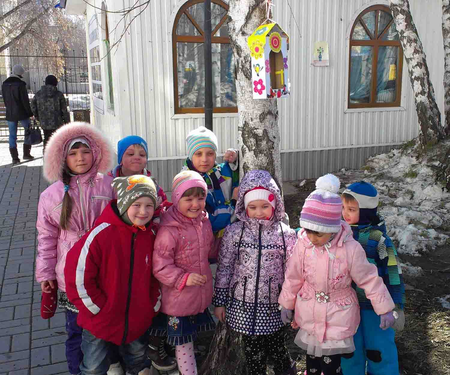 Конечно же, ребятам не терпелось прикрепить ее к дереву во дворе храма и покормить птиц. Шумно и весело, с большим удовольствием они сыпали в кормушку крошки для птичек, которые непременно прилетят сюда.