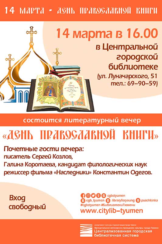 12 марта 2019 г. 14 марта, в День православной книги, в Центральной городской библиотеке Тюмени по адресу ул. Луначарского, 51 состоится литературный вечер, посвященный этому празднику. Начало встречи – в 16:00. Среди почетных гостей литературного вечера – писатель Сергей Козлов; краевед, кандидат филологических наук Галина Коротаева; режиссер фильма «Наследники» Константин Одегов.