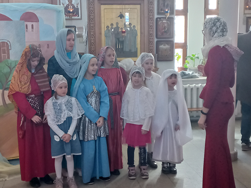 Дети воскресной школы показали пасхальную сказку, спели стихиры Пасхи, прочитали пасхальные стихи. В дар все присутствующие получили пасхальное яичко, как символ Воскресения.