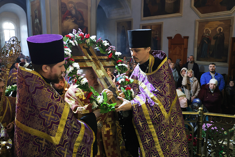 После пения Великого славословия, Глава Тобольской митрополии торжественно изнес Животворящий Крест Господень – напоминание о приближающейся Страстной Седмице и Пасхе Христовой. Духовенство исполнило песнопение: «Кресту Твоему покланяемся, Владыко, и святое воскресение Твое славим».