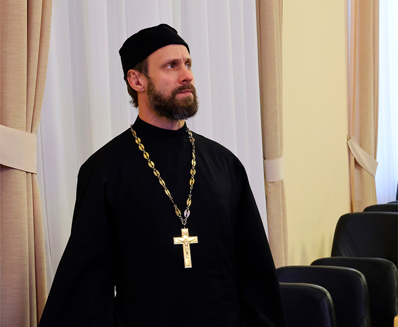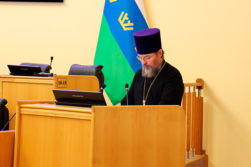 В зале областной думы собрались педагоги, политики, представители общественных организаций, председатель епархиального отдела по взаимодействию с Вооруженными Силами и правоохранительными органами иерей Стефан Любимов.