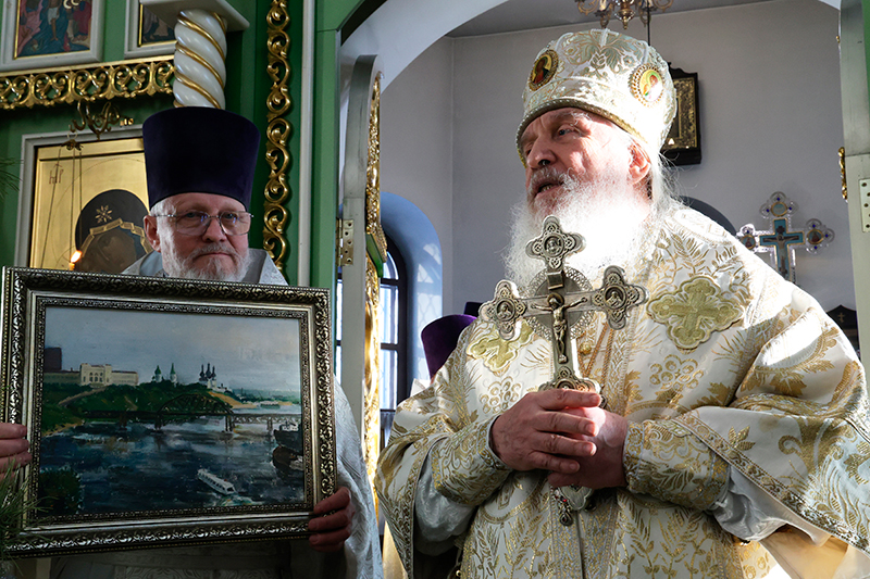 Далее настоятель храма иерей Владимир Язов поблагодарил Архипастыря за совершение богослужения и преподнес в дар картину с изображением исторической части Тюмени.