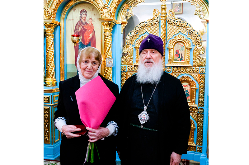 Затем Глава Тобольской митрополии наградил директора Воскресной школы храма «Утоли моя печали» Зою Павловну Юркову юбилейной медалью «400-летие Тобольской епархии».