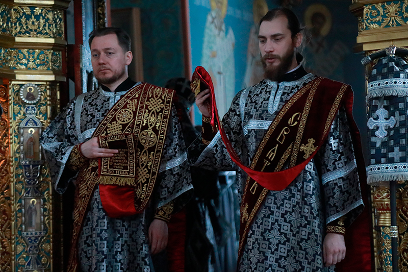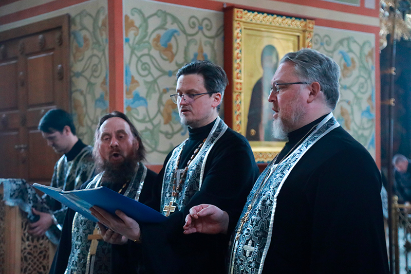 Песнопение «Да исправится молитва моя» исполнили протоиерей Игорь Хмелёв, настоятель Вознесенско-Георгиевского храма г. Тюмени; протоиерей Вадим Баранов, настоятель храма в честь апостола Иоанна Богослова с. Шорохово Исетского района, иерей Виталий Виштак, клирик Софийско-Успенского кафедрального собора г. Тобольска.