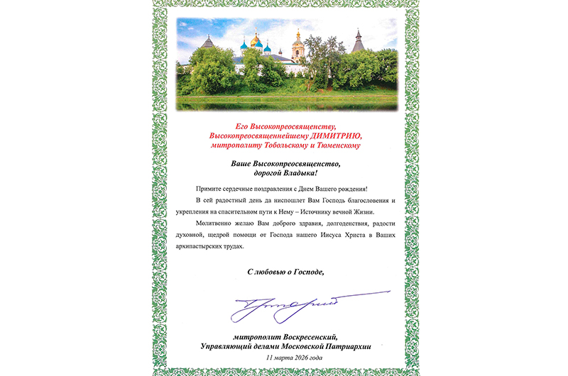 Поздравительная телеграмма для Главы Тобольской митрополии