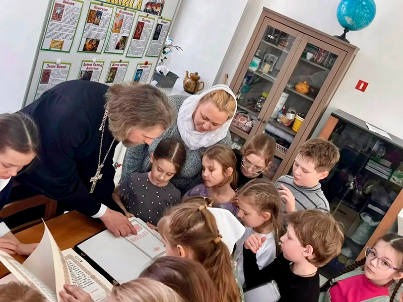 В субботу занятие началось с того, что пришел о. Алексий и рассказал детям о начале книгопечатания на Руси, о первопечатнике - диаконе Иване Федорове и первой книге – «Апостол». Он показал богослужебную книгу, которая содержит части Нового Завета - Деяния и Послания святых Апостолов. Принес и Евангелие. Дети с большим благоговением и интересом рассматривали книги, удивлялись и внешней красоте, и что написаны они на церковнославянском языке, пытались прочитать. Забавно было услышать, как с детской непосредственностью один ребенок сказал другим детям: «Священнику-то надо быть еще и таким умным - знать языки, чтобы это читать!» А другой: «Ничего себе, какая тяжелая книга, надо ему еще и сильным быть, и терпеливым». Кто-то размышлял: «Сколько карат золота здесь?» Оказывается, что обложку книги меняют в зависимости от праздника, как и облачение священника.