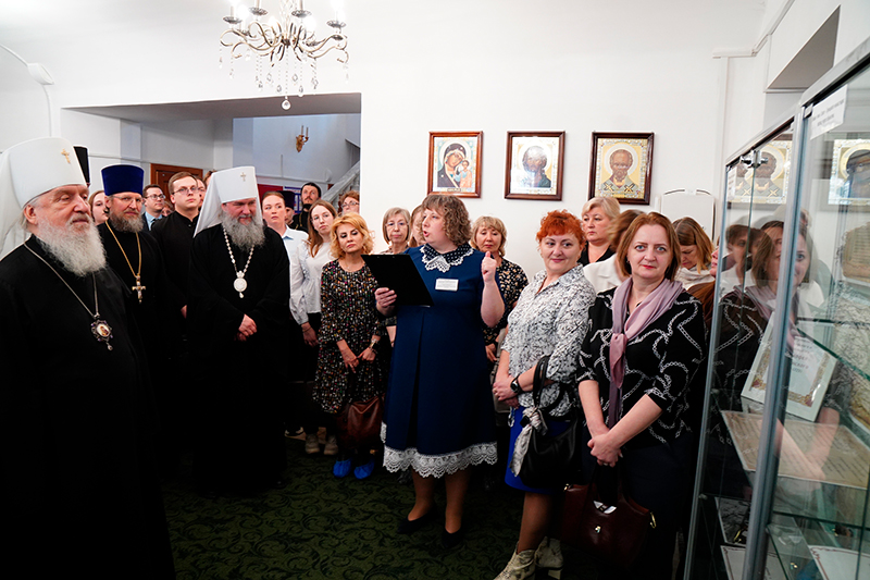 Перед семинаром заместитель председателя ОРОиК Шутова Светлана Владиславовна и председатель Ассоциации православных педагогов Шилова Надежда Александровна представили в фойе Духовно-просветительского центра участникам выставку, отражающую результаты взаимодействия Тобольской епархии с образовательными учреждениями через конкурсы, просветительские, образовательные и экскурсионные проекты, мастер-классы и совместные мероприятия. Выставка посвящена 410-летию Свято-Троицкого монастыря г. Тюмени. По сложившейся традиции региональная тематика находит свое отражение в темах организуемых ОРОиК экспозиций и выставок, а также общественно значимых мероприятий местного и областного уровня, таких как Филофеевские и Кирилло-Мефодиевские чтения. В епархиальных мероприятиях, проводимых ОРОиК, в частности в данной выставке, принимают участие все категории учащихся учебных и воспитательных организаций – от детских садов до вузов. Все выставленные работы в смысловом плане объединены авторским образовательным курсом «История Православия в Сибири». Автор курса – насельник Св.-Троицкого монастыря иеромонах Сергий (Завгородний).